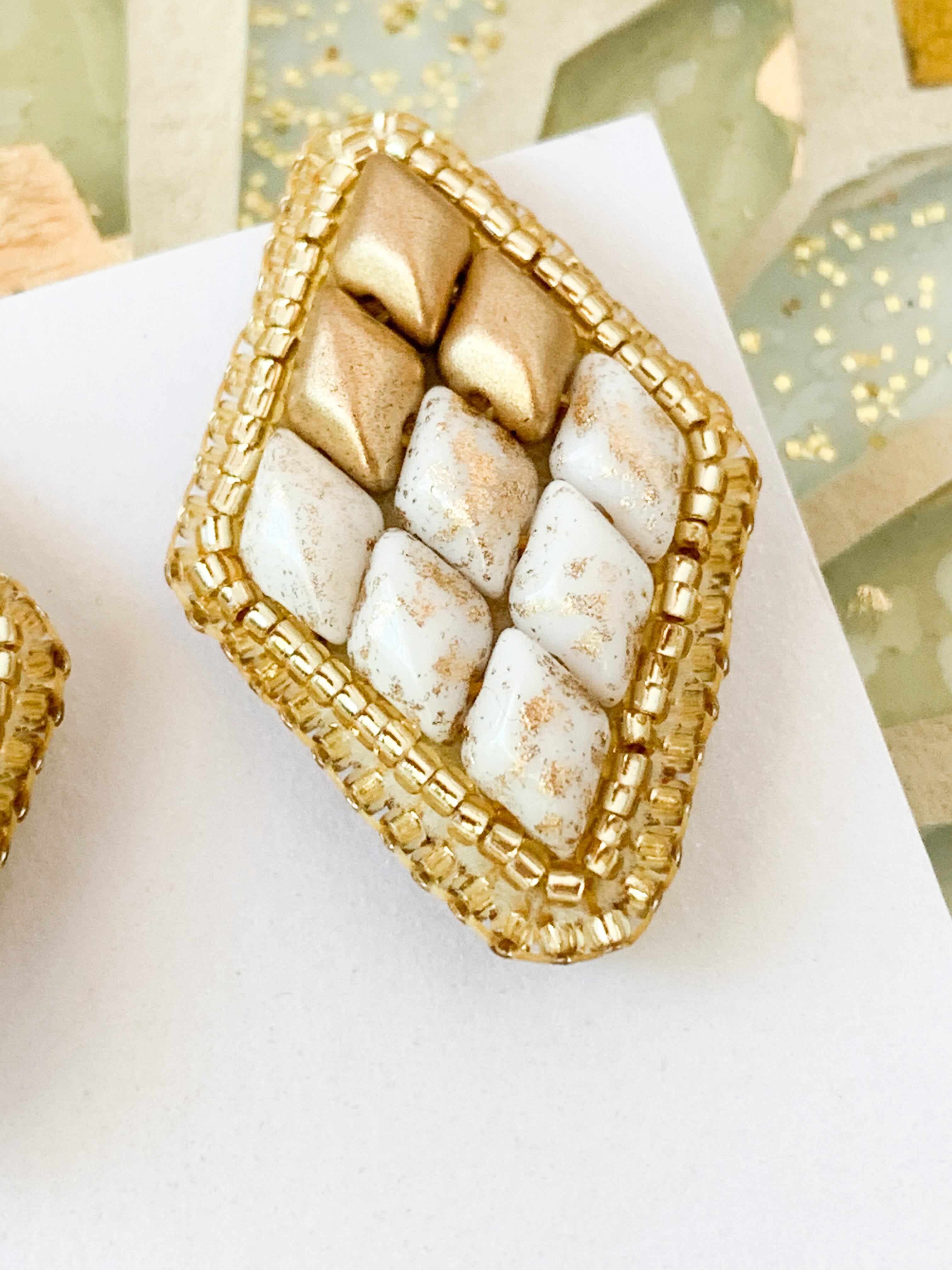 【人気NO1❣️】百貨店ポップアップで大人気 ビーズ刺繍のひし形イヤリング 白 サージカルステンレス金具
