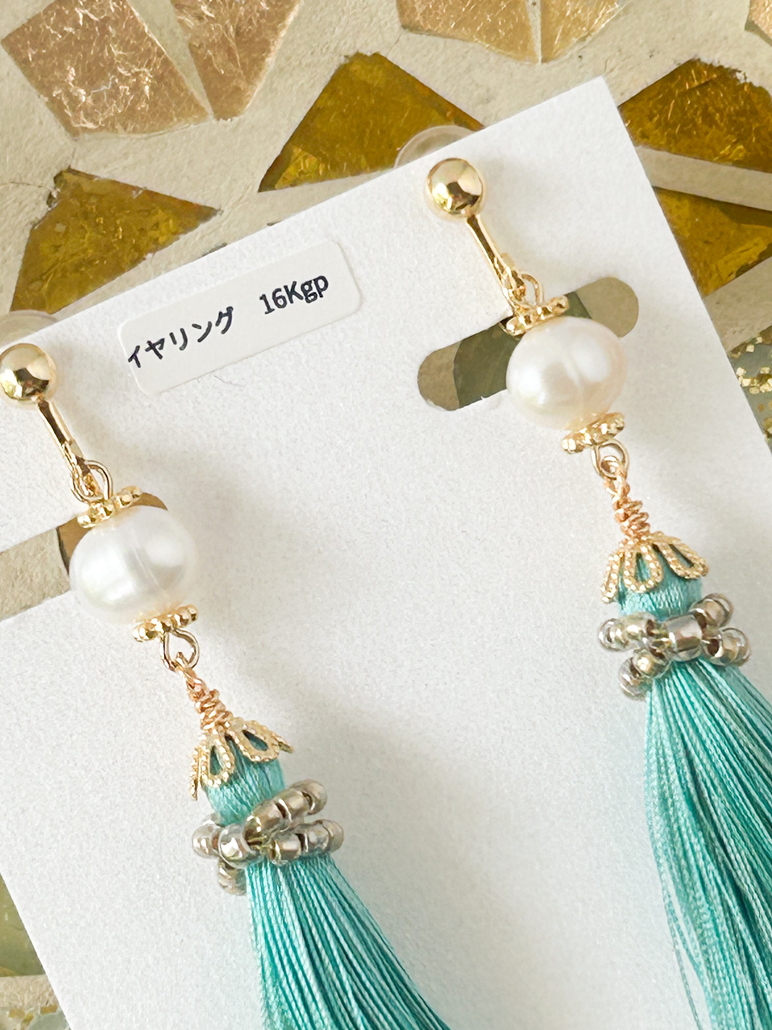 本物思考の方へ ターコイズグリーンのシルクタッセルイヤリング 16KGP金具